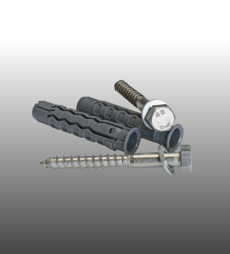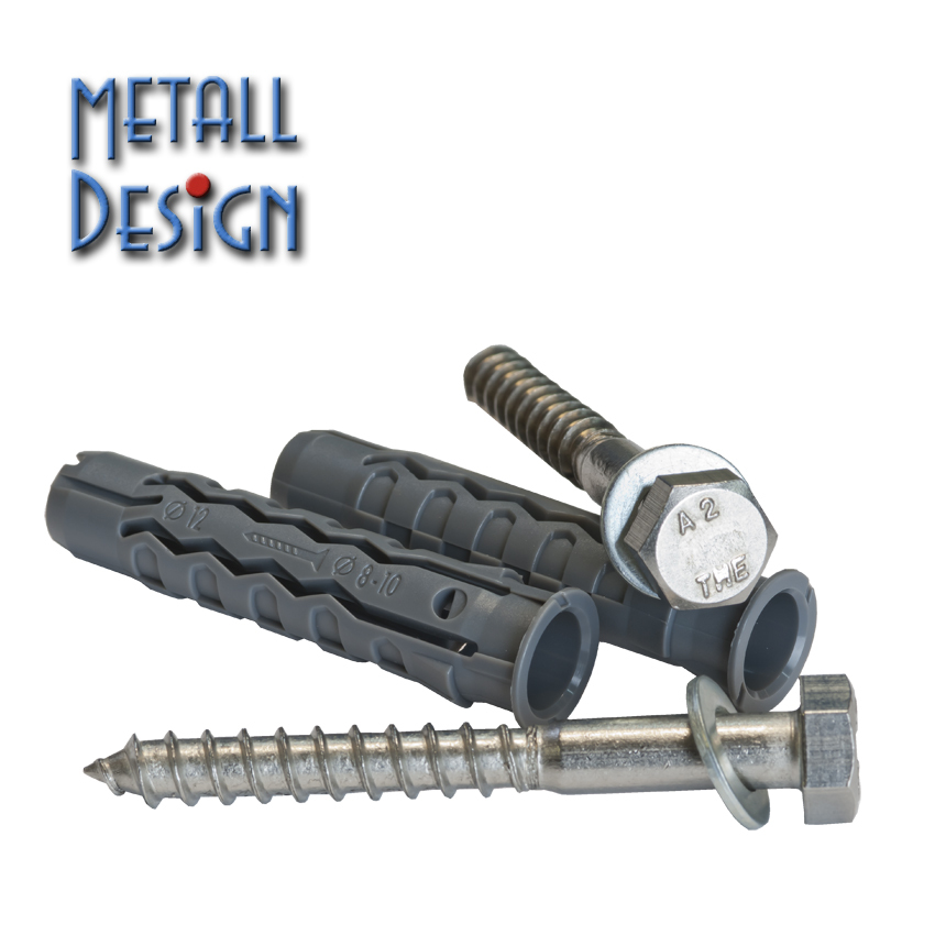 Wir liefern jeweils ein Set für einen Handlaufhalter, bestehend aus 2 Sechskant-Schrauben mit passendem Dübel und Unterlegscheibe für Ihren Handlauf aus Schmiedeeisen.