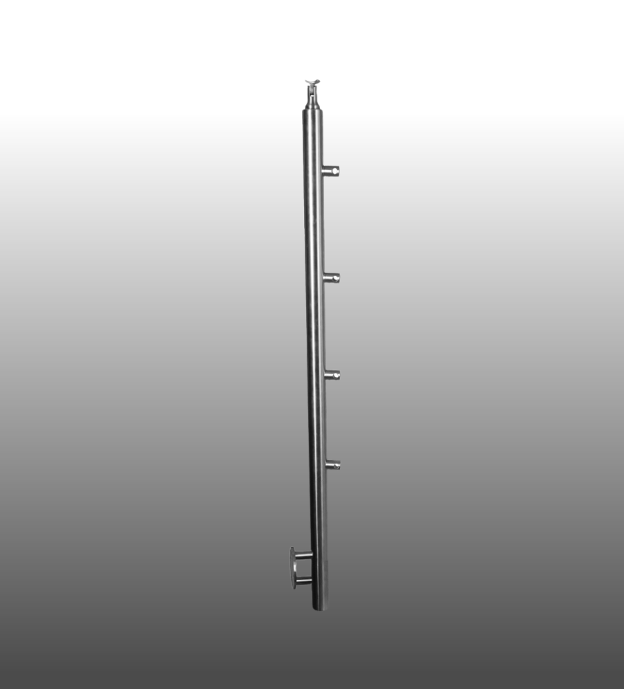 Geländerpfosten mit 4 Querstabhaltern. Die seitliche Befestigung an einer Treppe, an einem Balkon als Balkongeländer, oder einer Terasse als Brüstungsgeländer sind die Einsatzorte für diesen hochwertigen Geländerpfosten. Der Abstand der Befestigungsplatte bis zum Pfosten beträgt 46 mm, gemessen von beiden Innenseiten.