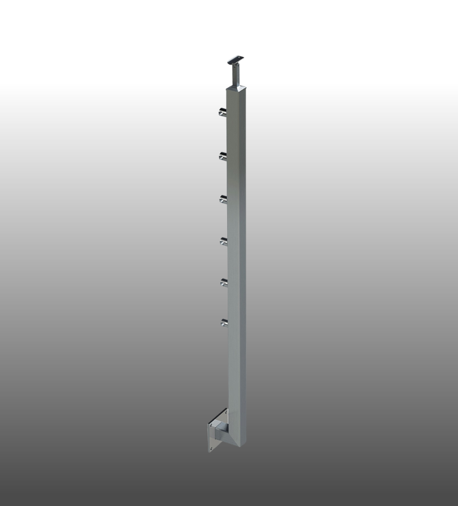 Geländerpfosten aus Vierkantrohr für Relinggeländer mit 6 Querstabhaltern sowie der seitlichen Befestigung.