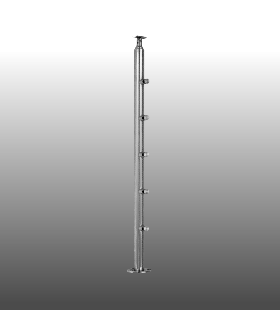Geländerpfosten Edelstahl für Geländer zum Aufdübeln mit 5 Querstabhaltern für 10 mm, 12 mm, und 14 mm Rundstäbe-Edelstahl.