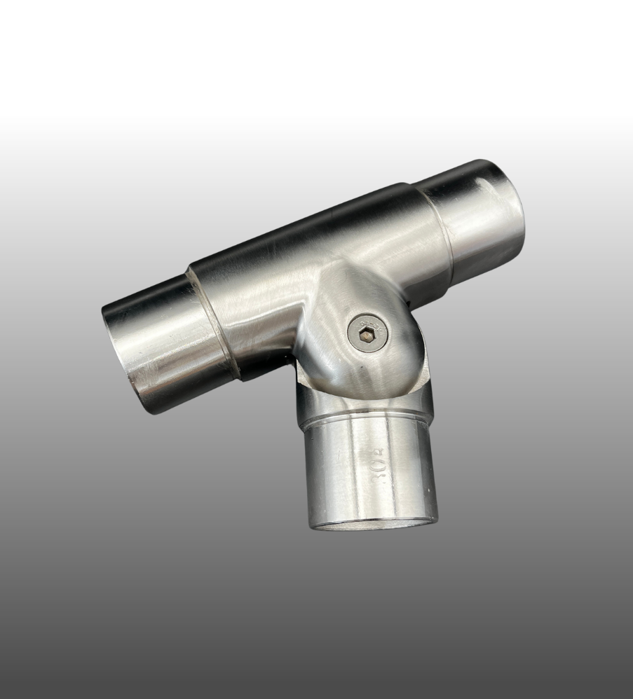 Dieser einstellbare T-Vebinder aus Edelstahl ist in Kombination mit unseren Basis Geländerpfosten aus Edelstahl zur Anfertigung von freistehenden Handläufen und Geländern aus Edelstahl an Treppen geeignet.