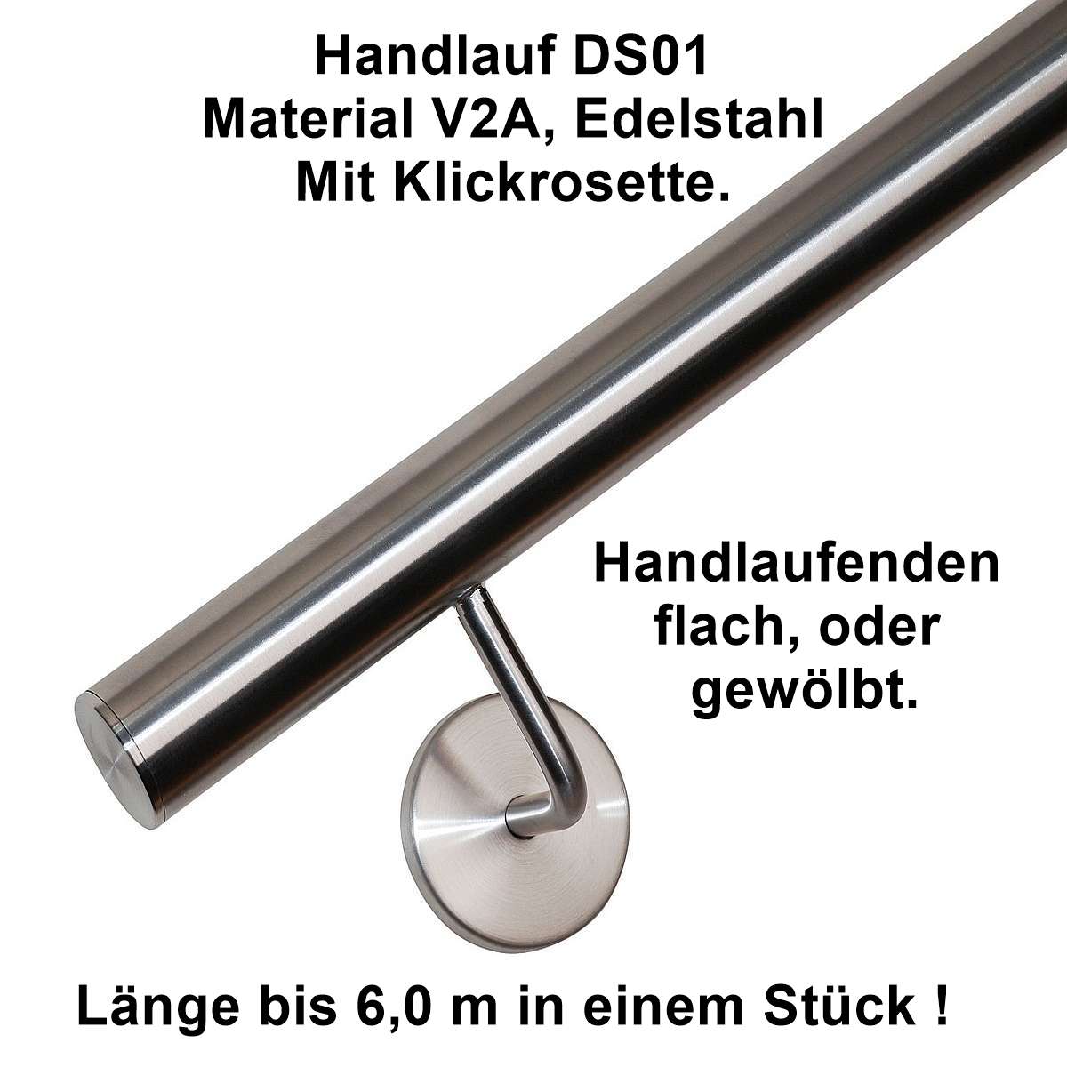 Geeignet grundsätzlich für alle pflegeleichten Anwendungen im Innenbereich, weiter für alle Anwendungen im Aussenbereich mit einen Abstand zur Küste von 50 Km. Bei Anwendungen weniger als 50 Km zur Küste im Aussenbereich, bitte den Handlauf mit Material V4A einsetzten. Was ist die Besonderheit von diesem Handlauf aus Edelstahl? Diese Handläufe sind einteilig und werden in einem Stück angefertigt, und immer auf Maß. Das macht eine Montage immer sehr einfach, und gibt dem Handlauf eine besondere Stabilität. Zusätzlich und Neu: Jetzt auch mit der Auswahl mit Klickrosetten, eine Besonderheit, und nur bei uns zu bekommen. Bei diesen Handlaufhaltern mit Klickrosette werden die Abdeckrosetten nicht mehr an der Wand verklebt. Diese werden jetzt einfach auf die Wandplatte geschoben, Klick, und fest. Ein späteres lösen ist jederzeit möglich z.B. bei Renovierungsarbeiten. Weitere Besonderheit nur bei uns: Bei diesem Handlauf Modell DS01 aus V2A Material, sind die Handlaufhalter angeschweißt, das macht diese Handläufe besonders stabil. Weiterer Vorteil gegenüber geschraubten Handlaufalter mit Anschraubplatte, ist der saubere Übergang beim Greifen. Daher auch oft im Einsatz bei öffentlichen Gebäuden, Krankenhäusern, Seniorenheimen, wo diese sehr oft eingesetzt wird als Standard. Welchen Durchmesser hat der Handlauf aus Edelstahl? Erhältlich ist der Handlauf mit Duchmessern wie folgt zur Auswahl: