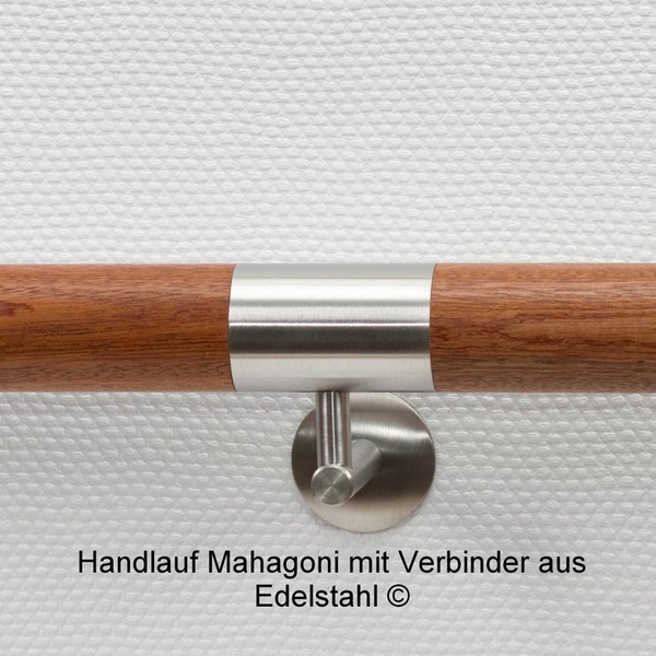Der Handlauf aus Mahagoni wird bis zu einer Länge von 4,0 m einteilig ohne Stoß in einem Stück gefertigt, über 4,0 m werden die Handläufe zweiteilig hergestellt mit einem mittigen Handlaufverbinder aus Edelstahl.