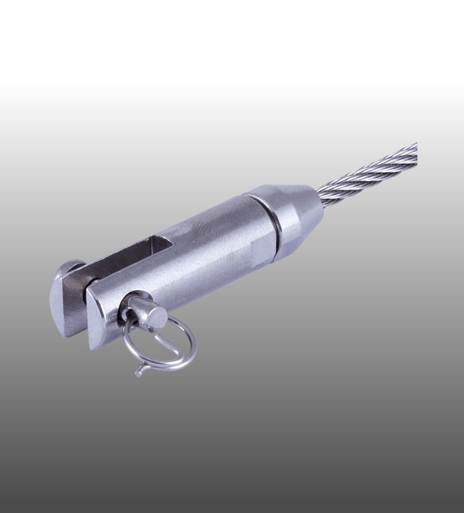 Seilterminal in Ausführung mit Schlitzfräsung und Querbolzen, zur Aufnahme von Augenschrauben.